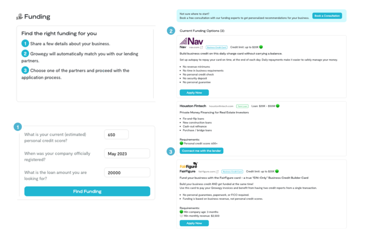 Unlock the financial support your business needs with our streamlined matching process. Simply share a few details about your business, and Growegy will compare your needs with lending requirements. We show you which trusted lending partners you qualify for or what you need to complete in order to qualify.