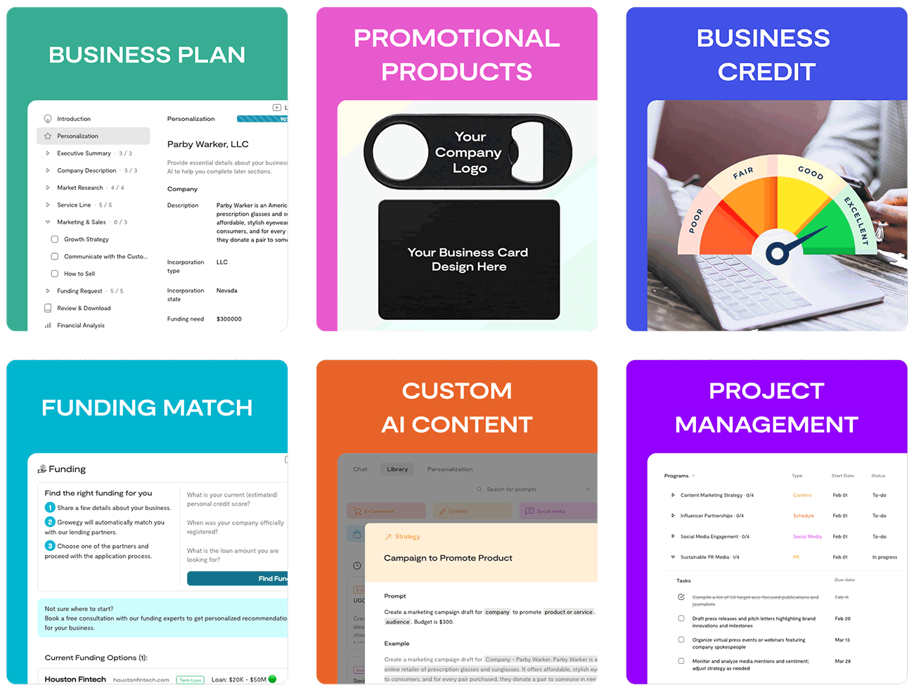 Everything you need to grow your business and position yourself for funding. From promotional products to business plans, marketing content AI to strategy meetings; Growegy accelerates your productivity. All while creating your business credit history and finding pathways for funding.