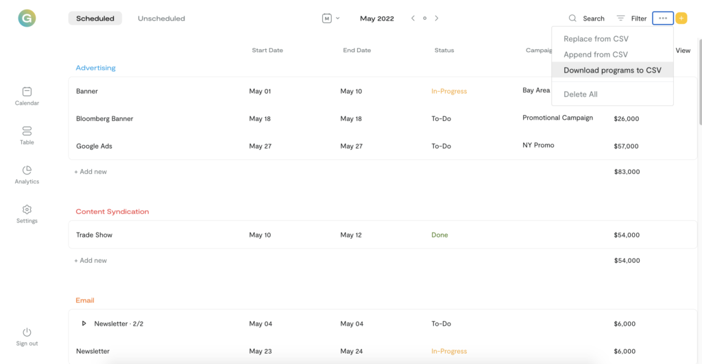 1. Navigate to Table >  Ellipsis Menu > click on Download programs to CSV