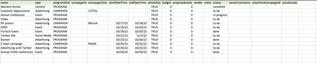 Important: Do not change the order of the rows. The order is crucial to maintaining the hierarchy and relationships between campaigns, programs, and tasks. Any changes to the row order may disrupt these relationships.