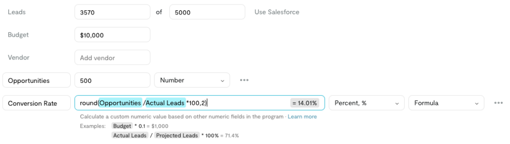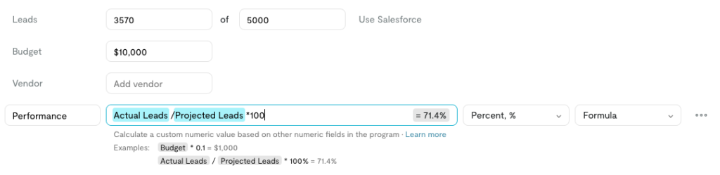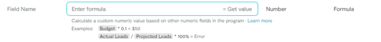 Formulas allow you and fellow members of the team to make a multitude of custom calculations and outputs based off of the numerical data inputted in a campaign or program card.