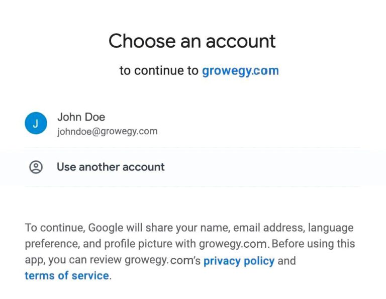 3. Select your Google account. If you have not connected an account, select Use another account and follow the steps to authorize Growegy to access your Google account.