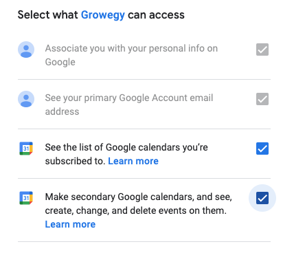 4. When authorizing Google Calendar, a popup appears requesting access for Growegy to