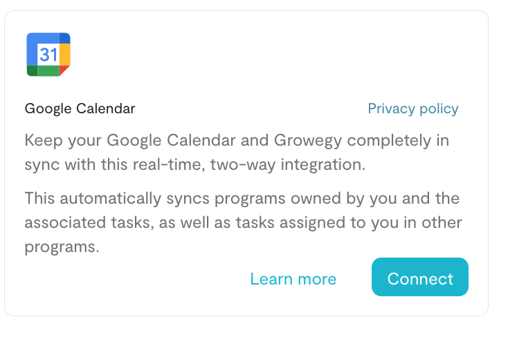 You may set up a real-time, two-way integration between Growegy and Google Calendar, so Growegy will reflect your programs and tasks into a newly created Secondary Google Calendar helping you be up-to-date with all activities scheduled! This automatically syncs programs and associated tasks owned by you, as well as tasks from other programs assigned to you.