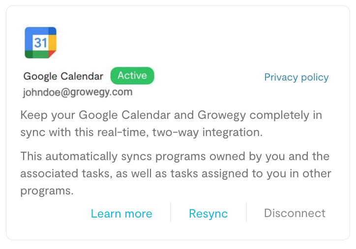 However, you can select Resync to explicitly ask Growegy export from scratch all yours programs and tasks. Allowseveral minutes for Growegy to finish resync procedure and observe all your data within your Google Calendar.