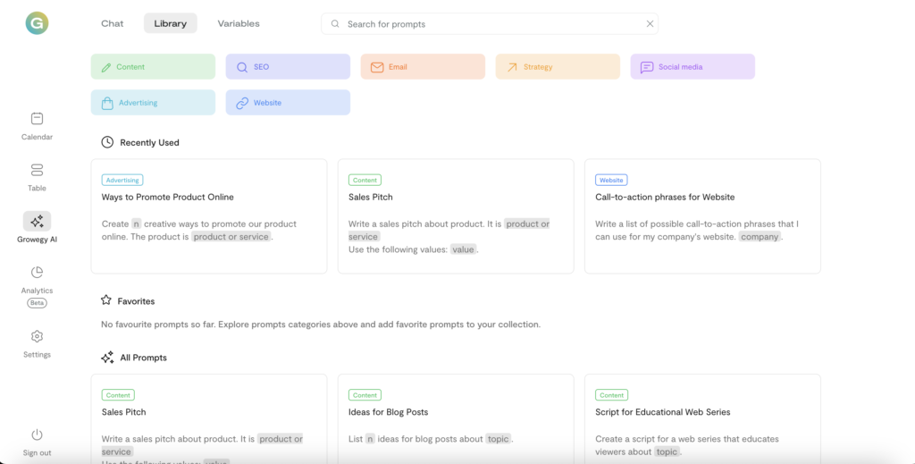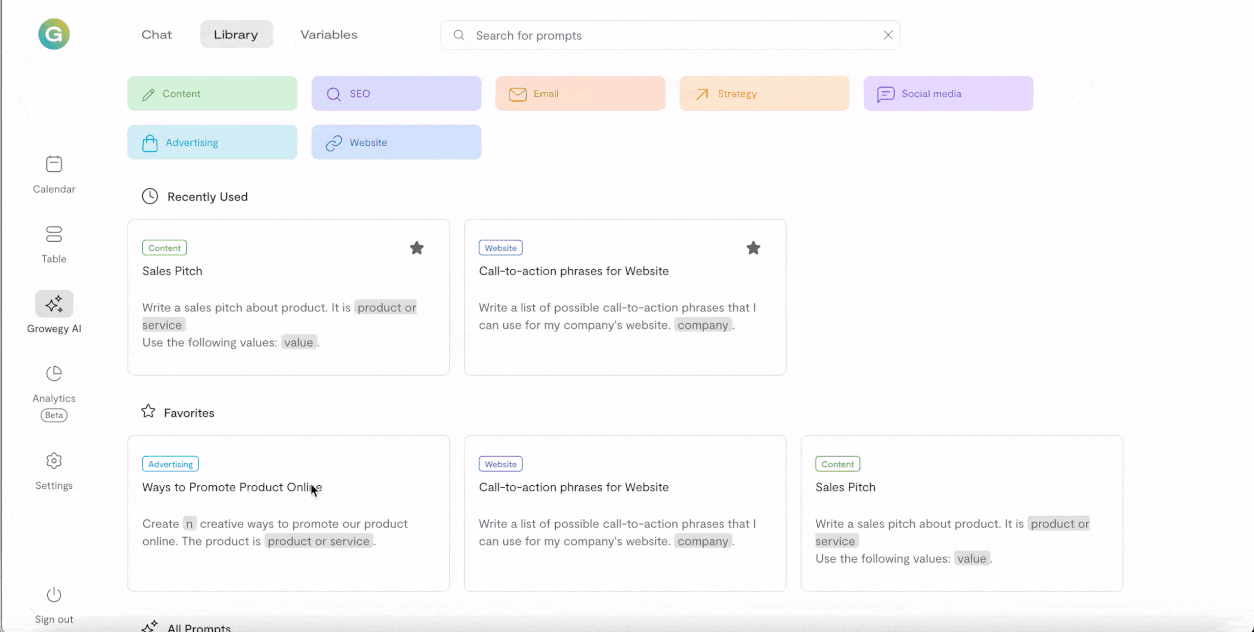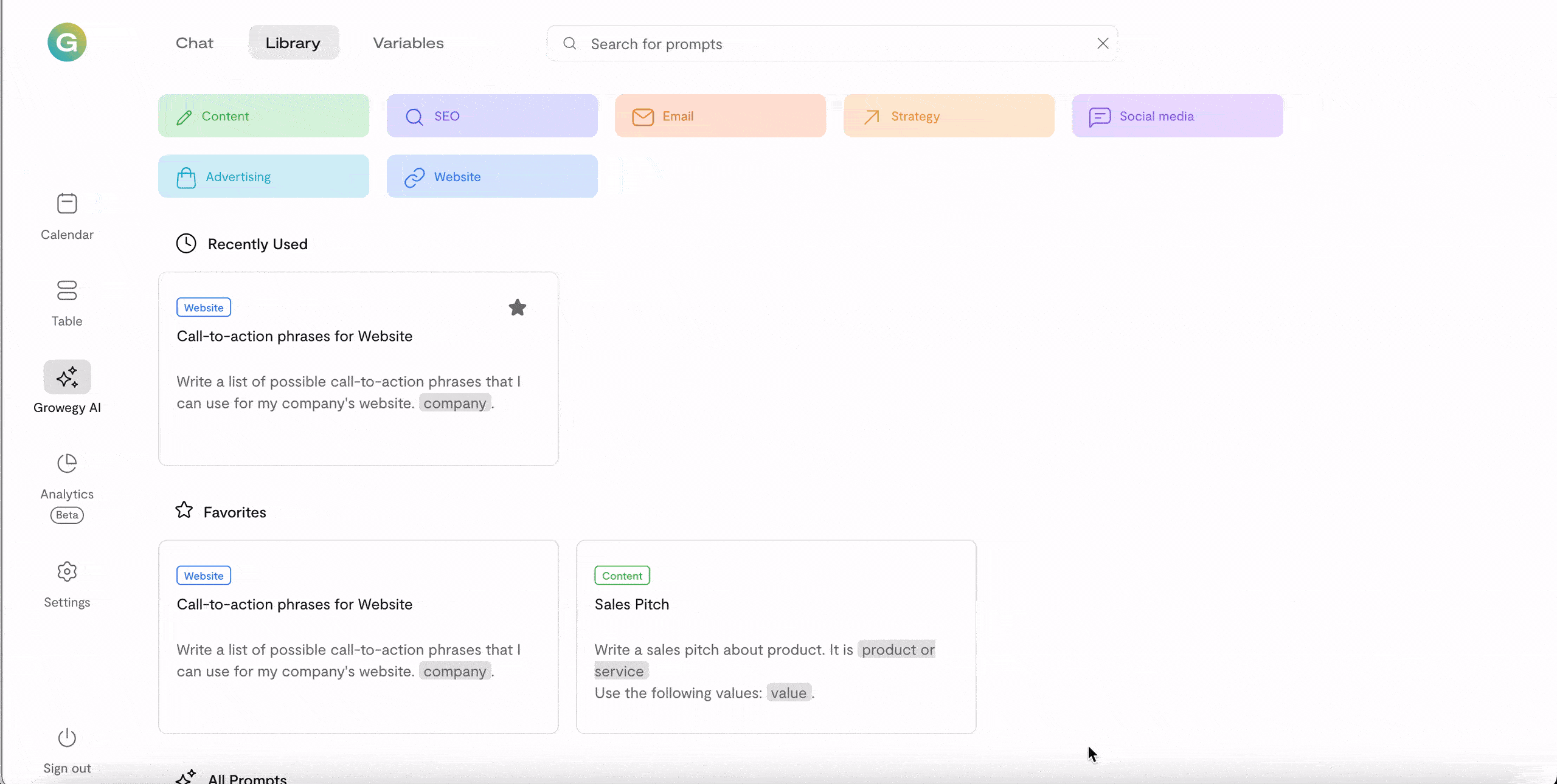 Continual work is underway to expand the Library by adding new prompts. Additionally, we are in the process of introducing a feature that allows users to create and save their own custom prompts and variables. This will provide users with even more flexibility and customization options. Stay tuned for these exciting updates!