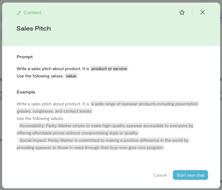 To access a prompt card, simply click on any prompt. Each card contains the category, title, prompt, and a usage example. The example demonstrates how a prompt can be customized with specific information. To utilize the prompt, click on “Start new chat”.